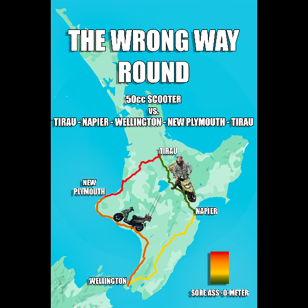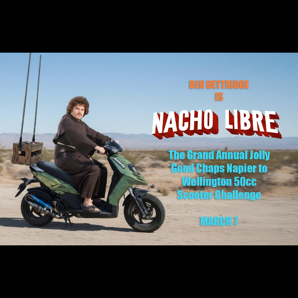 The Grand Annual Jolly Good Chaps Napier to Wellington 50cc Scooter Charity Challenge is a somewhat torturous charity event where participants ride a 50cc scooter from Mitre 10 Mega Napier carpark in Napier to the Wellington CBD.