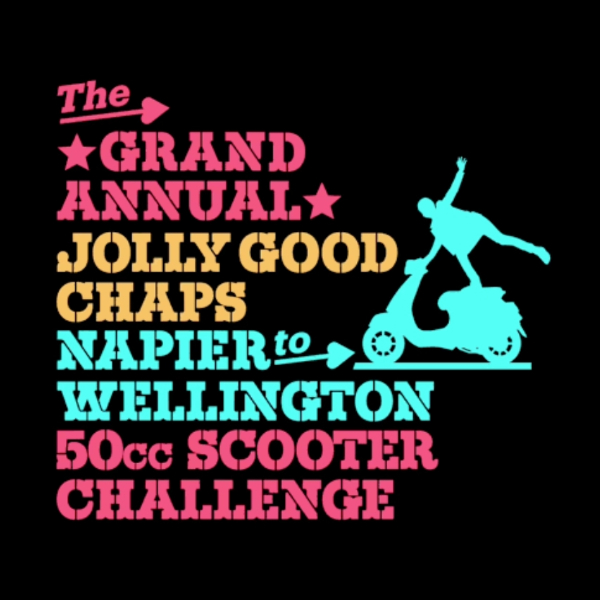 The Grand Annual Jolly Good Chaps Napier to Wellington 50cc Scooter Charity Challenge is a somewhat torturous charity event where participants ride a 50cc scooter from Mitre 10 Mega Napier carpark in Napier to the Wellington CBD.